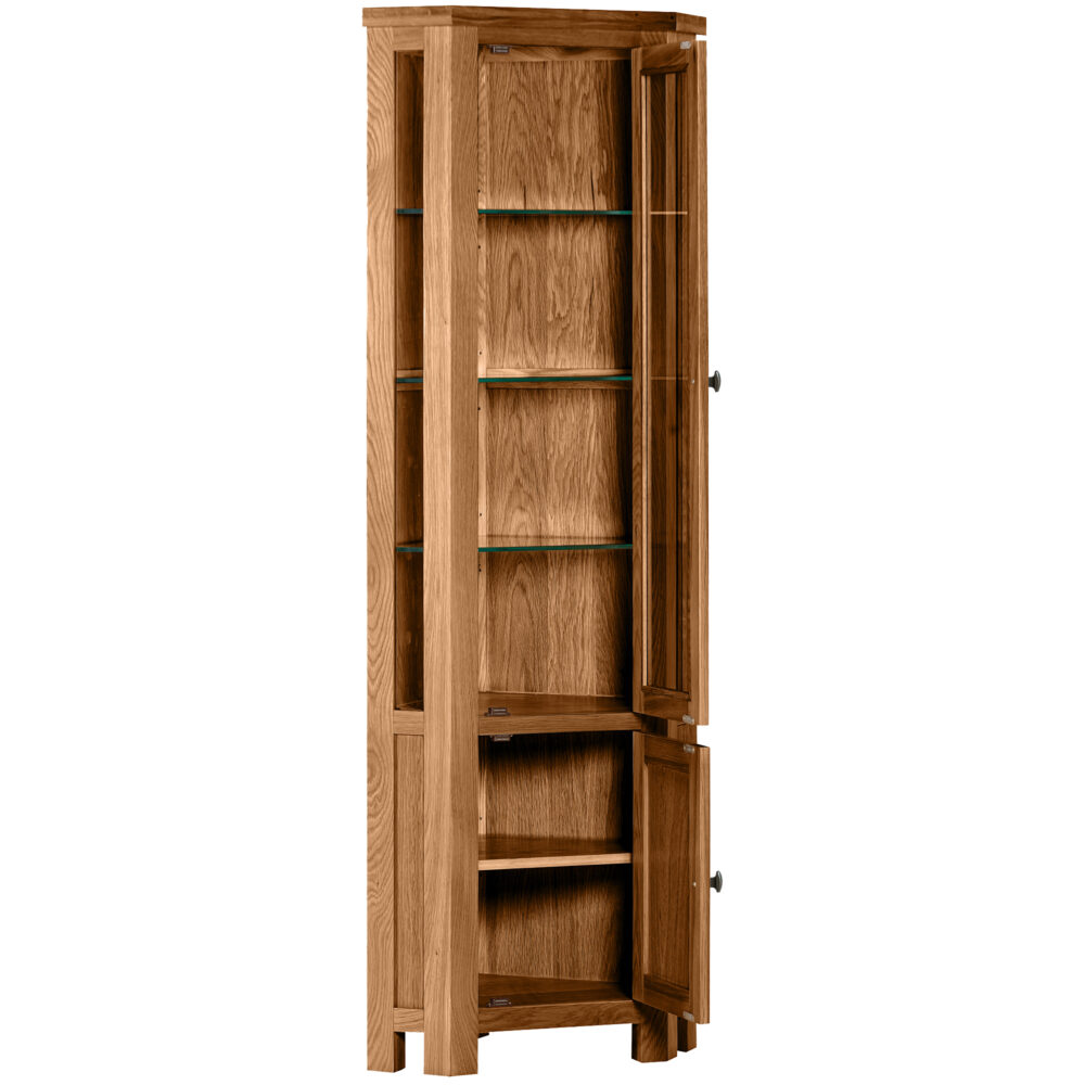 Our Eden Oak Corner Display Cabinet with Glass Doors, has been designed to offer excellent quality with a great modern design. Traditional methods of design and construction are used in the Eden Oak range including dovetail joints and tongue and grove drawer bases and finished in a dark coat of lacquer. This item is fully assembled in the factory and delivered in one piece into the room of your choice.